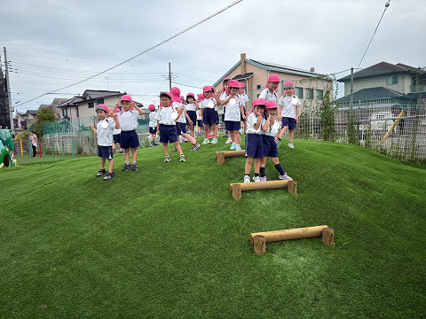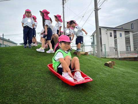 園庭のお山がきれいになり、階段が付きました! きれいになった山を見た子ども達は、『うわぁ~!!お山がきれいになってる🎵』と 瞳をキラキラさせながら、わくわくした表情を見せてくれました😊 ソリを使って友だちと芝滑りをしたり、芝にゴロゴロ寝転んでみたりと色々な遊び方を 楽しんでいます。 毎日厳しい暑さが続いていましたがようやく秋らしい気候になってきたので、これから 思い切り戸外遊びを楽しんでいきたいと思います😊