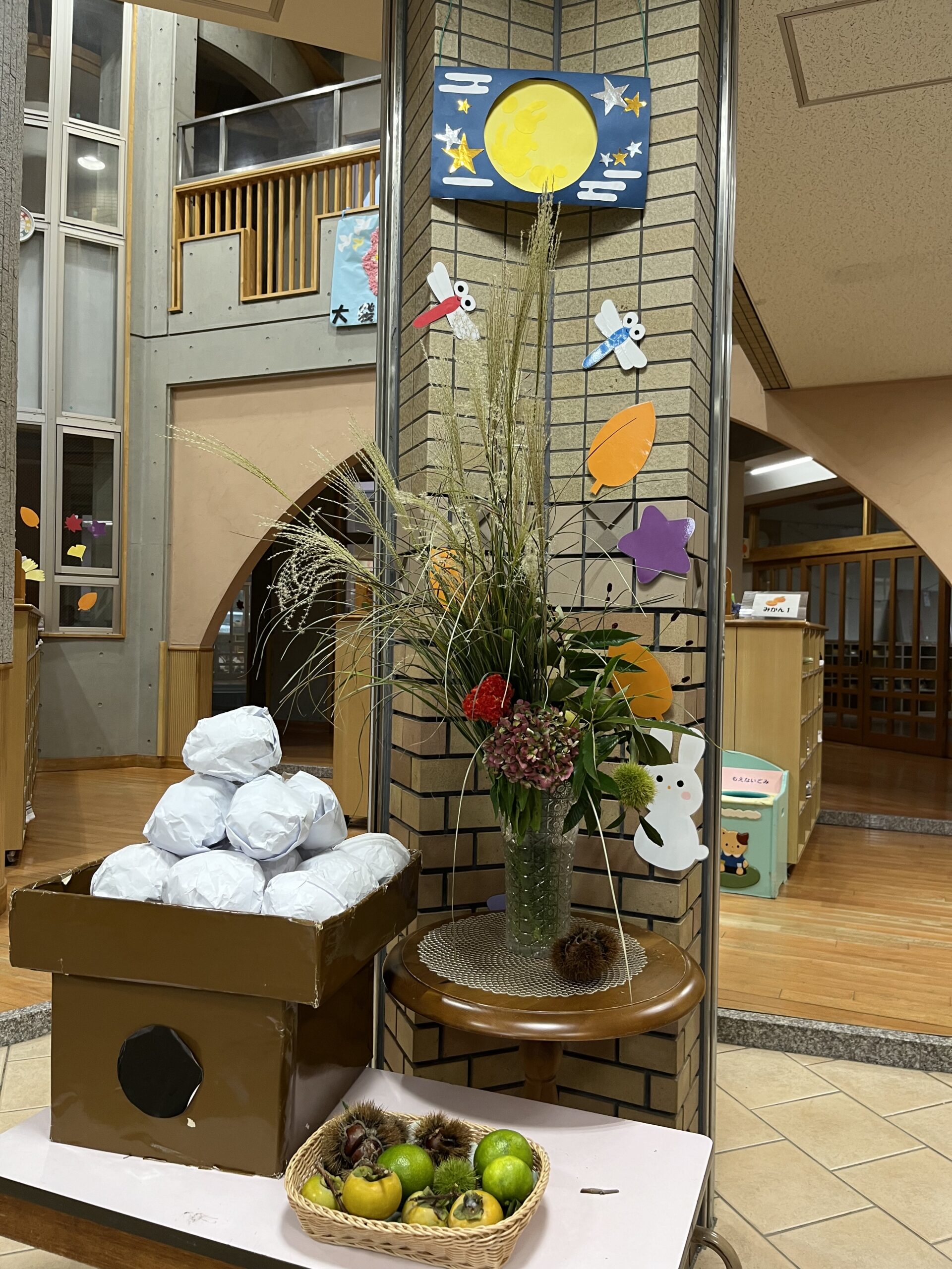 幼稚園の玄関には、ススキや大きなお月見団子に秋の果物が飾られています。