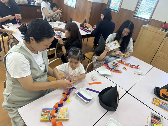 ハロウィンにちなんで今日は輪飾りと帽子を作りました。
