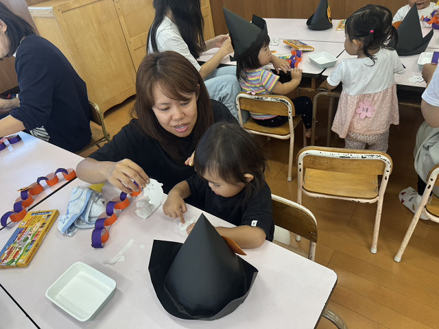 糊をぺたぺた貼りかわいいハロウィンの制作ができました。