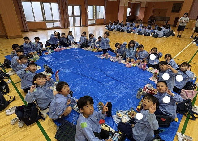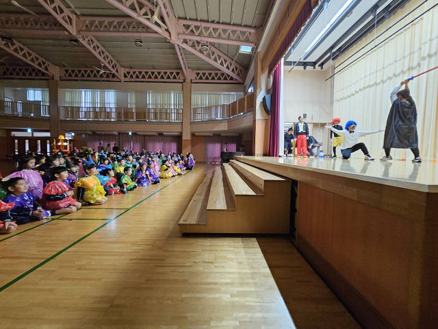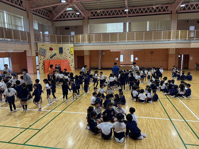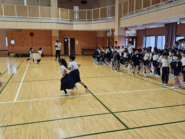 ホールではレクリエーションとしてデカパンリレーと猛獣狩りをしました!学年全員でゲーム遊びをすることはなかなかないので、子どもたちもとても楽しそうでした。