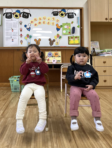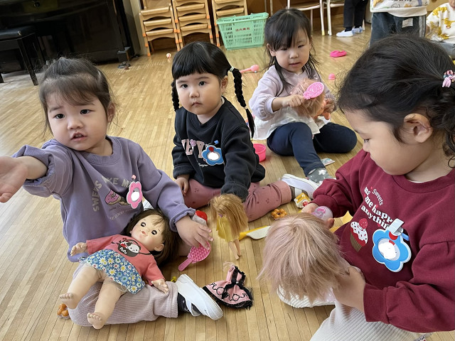 キディクラブでは毎月、クラスでお誕生日会を行なっています。お誕生日の歌を歌ったり、楽しいペープサートや紙芝居を見たり、賑やかなお誕生日会となっています。お祝いをしてもらう子も、お祝いをする子も皆んながとても嬉しそうで、ほっこり楽しい時間です。 またお人形のお世話をする事が大好きなキディクラブのお友だち。ママやパパの真似っこをしながら、お人形に優しくミルクをあげています。小さなママやパパのようでとっても可愛いです。子どもたちの大好きな遊びを通して、お友だちとの関わりも深まっていますよ。