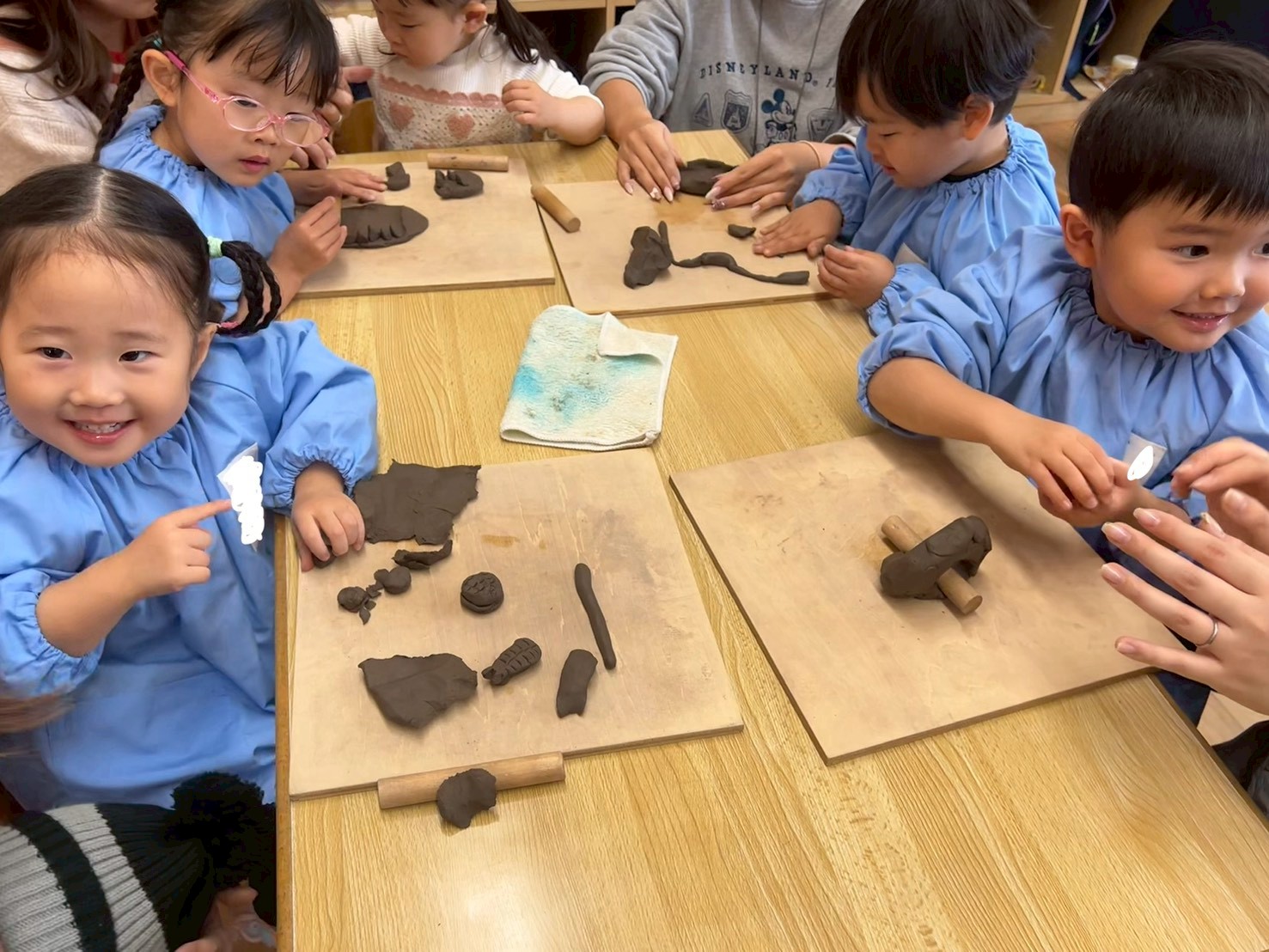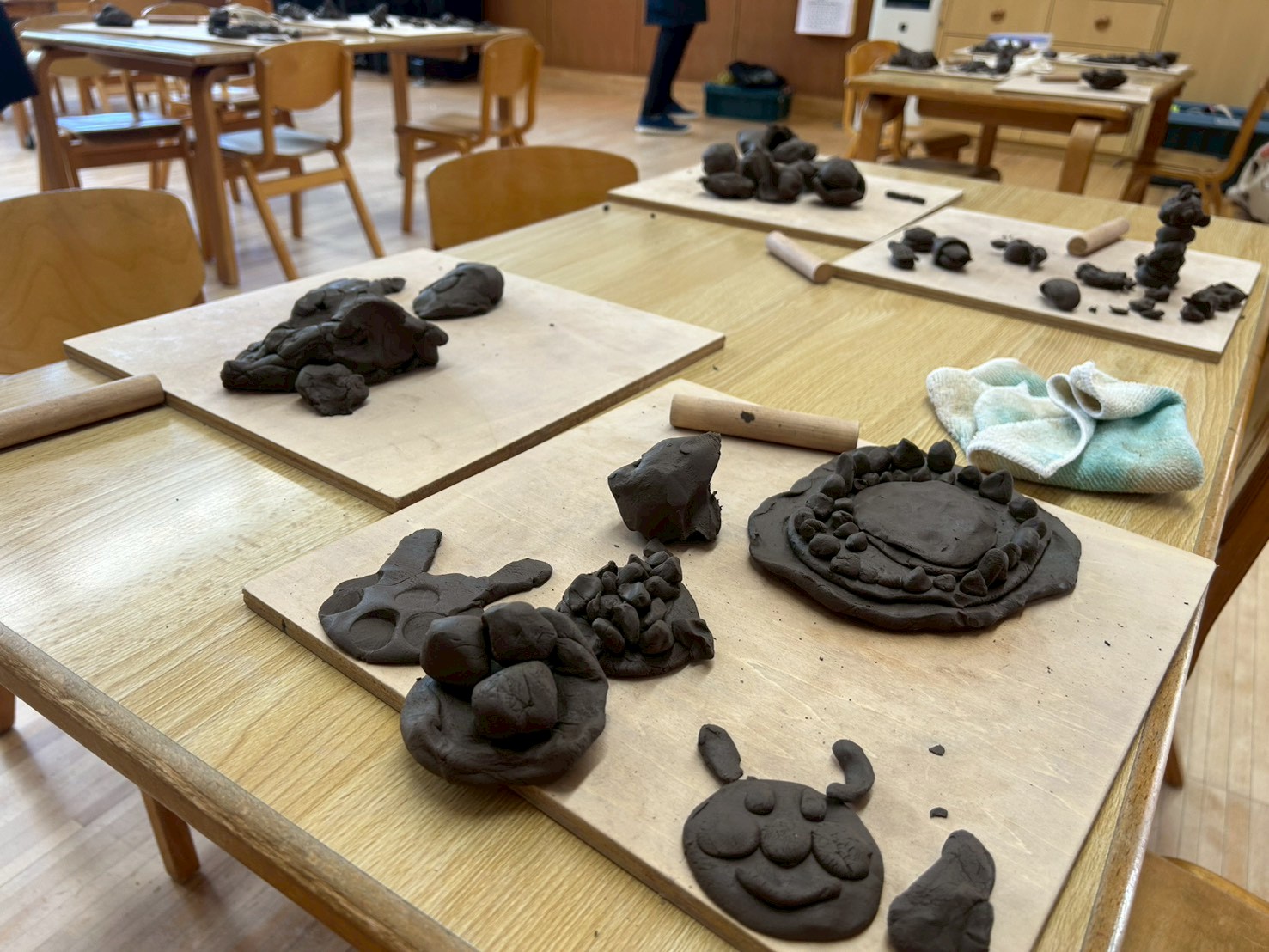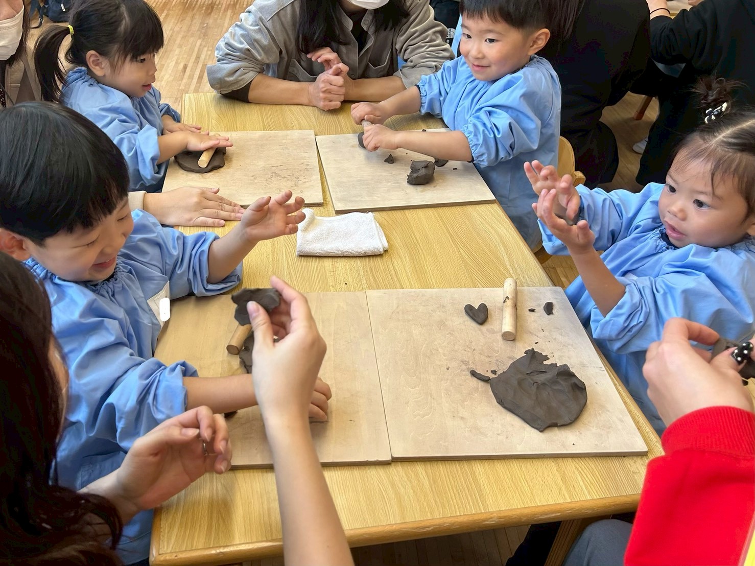 また、最初は冷たくてかたい土粘土ですが、触っていくうちに粘土が体温でほぐれていき、それと共に子ども達の表情も柔らいでいきました。保護者の方も少しづつリラックスされてきて子ども達と一緒に夢中になって取り組まれていました。