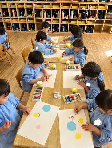 丸からの発想という事でイメージを膨らませてのびのびと制作する子どもたち。いろいろな大きさの丸画用紙を貼った後にクレヨンでお友だちや家族の顔を描いたりと一人ひとりの個性が輝く素敵な作品が完成しました。子どもたちの自由な発想がとても面白かったです!