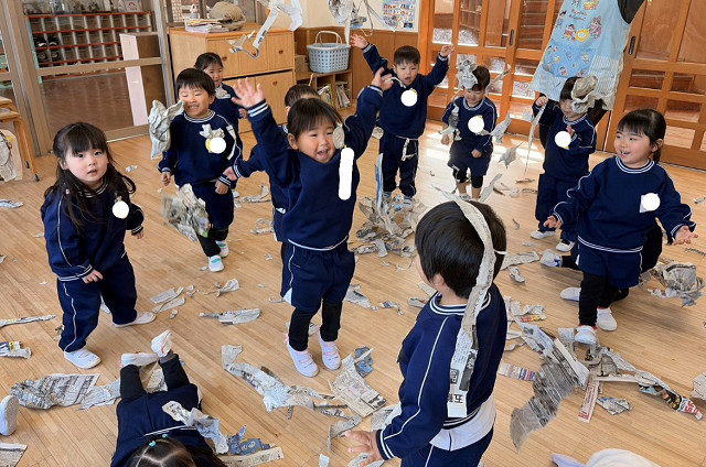 2組さんは、明日の豆まき会で使うお豆を新聞紙で作りました!