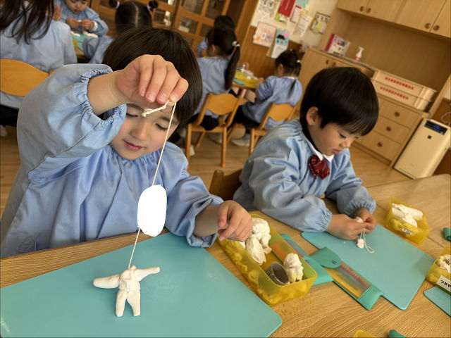 今日は年少さん最後の美術指導がありました。いつも使っている粘土に「ひも」が仲間入りして、