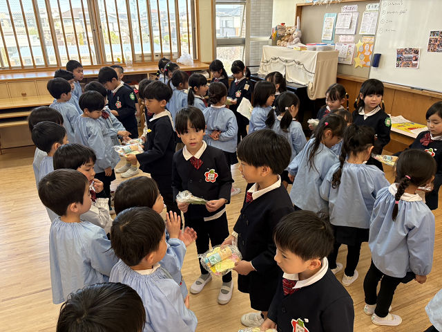お互いにプレゼント交換もしました。年長さんからは、来年度のカレンダー。みかん組・年少・年中組さんからは、写真立てをもらいました。